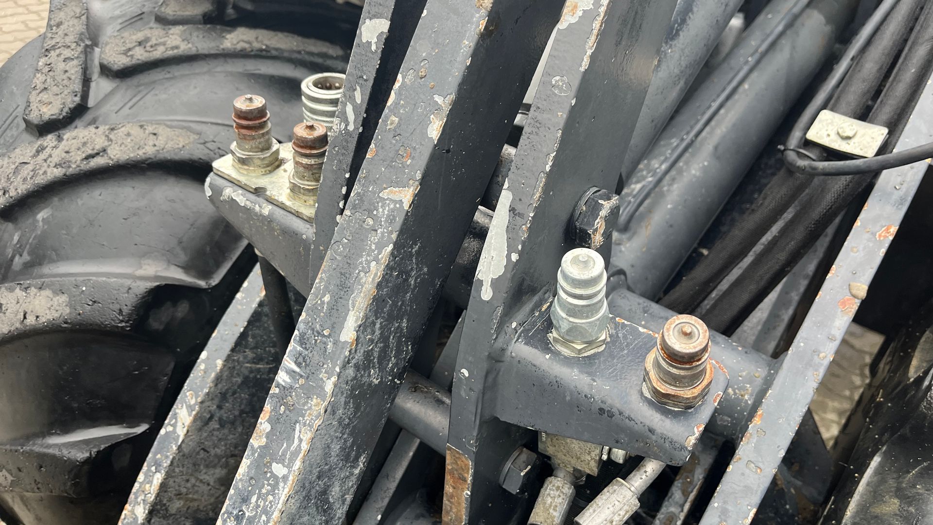 Med brede hjul og skærmforøger. foldbar tag, dobbelt hydraulik udtag på arm. hydraulisk Giant hurtigskifte med skovl og gafler.